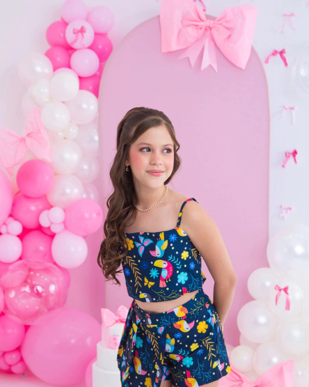 Produzido em tecido leve e fresquinho, o conjunto possui estampa exclusiva de tucanos sobre um fundo azul vibrante, trazendo um ar alegre e divertido que combina com os dias mais ensolarados. O cropped conta com alças reguláveis, que garantem um ajuste perfeito ao corpo, e detalhes de elástico nas costas, oferecendo mais conforto e liberdade de movimento.